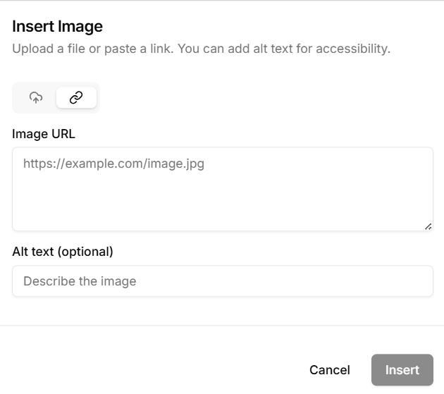 To upload and embed and image, just click the picture icon (shown below) and choose your file or drag it into the box. Then your image will immediately be embedded into your article.